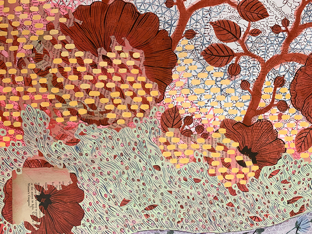 My work is process-driven and reactive, I hardly ever begin with a fully formed idea, just with the seed of an idea, and then go from there, slowly building on that initial spark. Sometimes the work comes out very differently than I thought it would. I commune with the work through the meditative process of creating repetitive hand-drawn and collaged patterns, layering drawing, hand-pulled prints, watercolor washes, and collage as I strive to intertwine figures and environment.