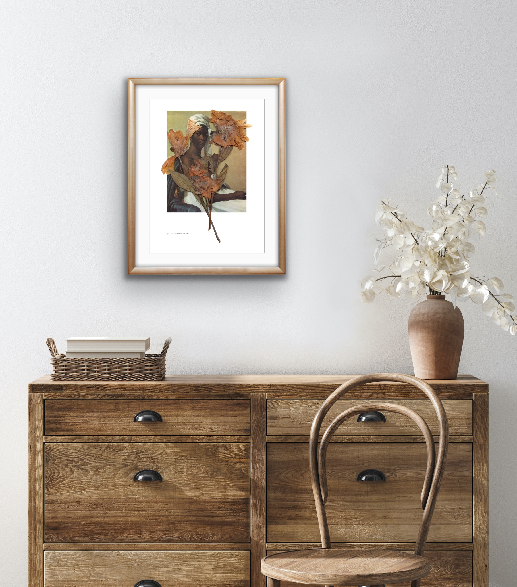 During my final year of undergrad, I knew that I had something good in all the books that I had pressed plants in over the years. My problem was: I didn’t know how to share or communicate these pressings to others. I brought all of my notebooks and books from over the years to a professor’s office. It was when I opened The Louvré that she and I were able to brainstorm and find a way to share what I, and the flowers, had made. I copied the pages of the books verbatim–where the flowers had molded directly over and through the illustrations. For the first three images I made, I did not intervene at all (Eve/Pandora, Elisabeth of Austria, and Madeleine). After I made these images, I was offered a solo show at the Gladstone Hotel in Toronto, Ontario. I used this concept I had previously discovered and intentionally placed plants for the remainder of the series–though I had no control over how much or how little the plants would mold to the pages or spread out. It was more of a collaborative project with the plants.
